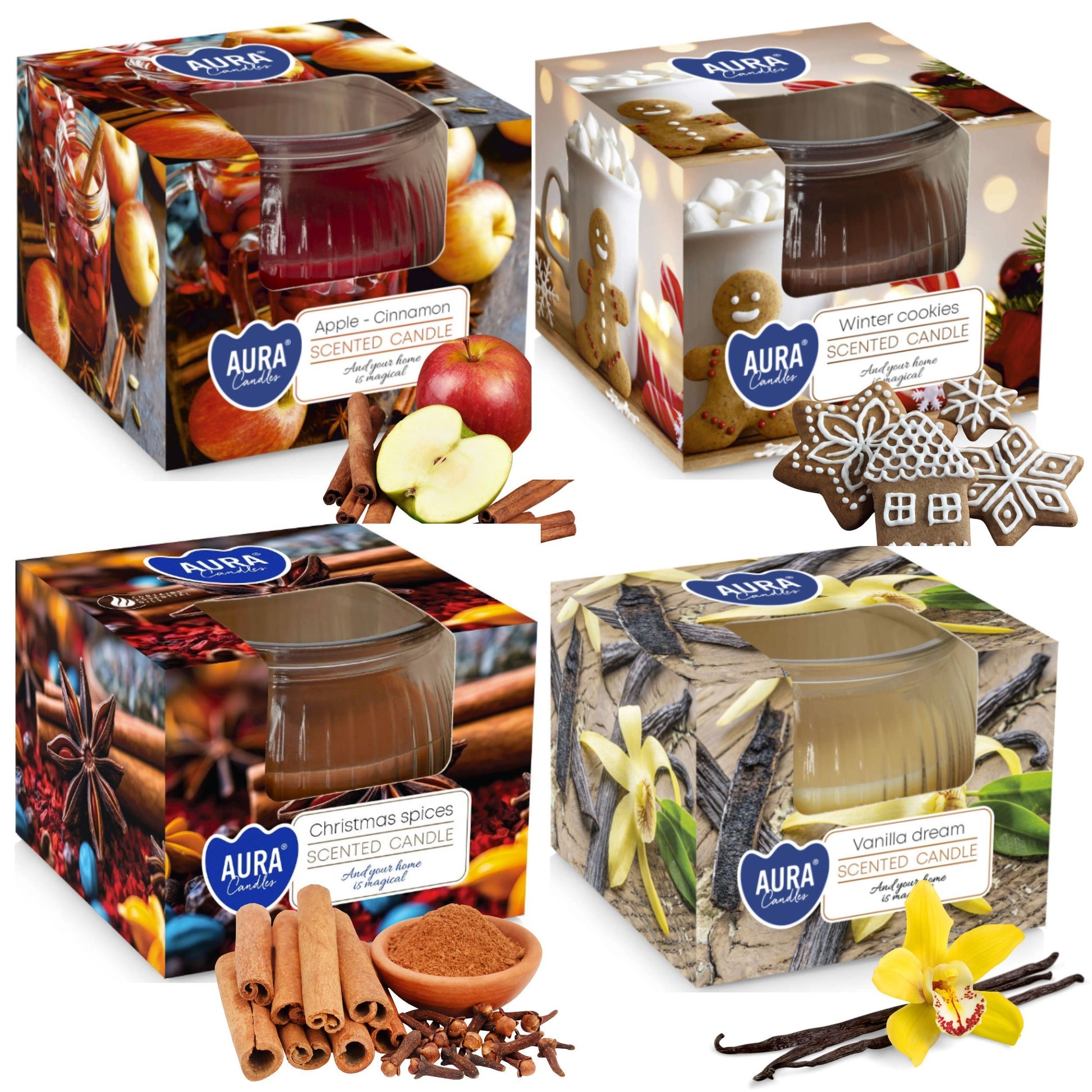✨ Zestaw 4 Świątecznych Świec Zapachowych – Wanilia, Piernik, Jabłko z Cynamonem, Przyprawy Korzenne